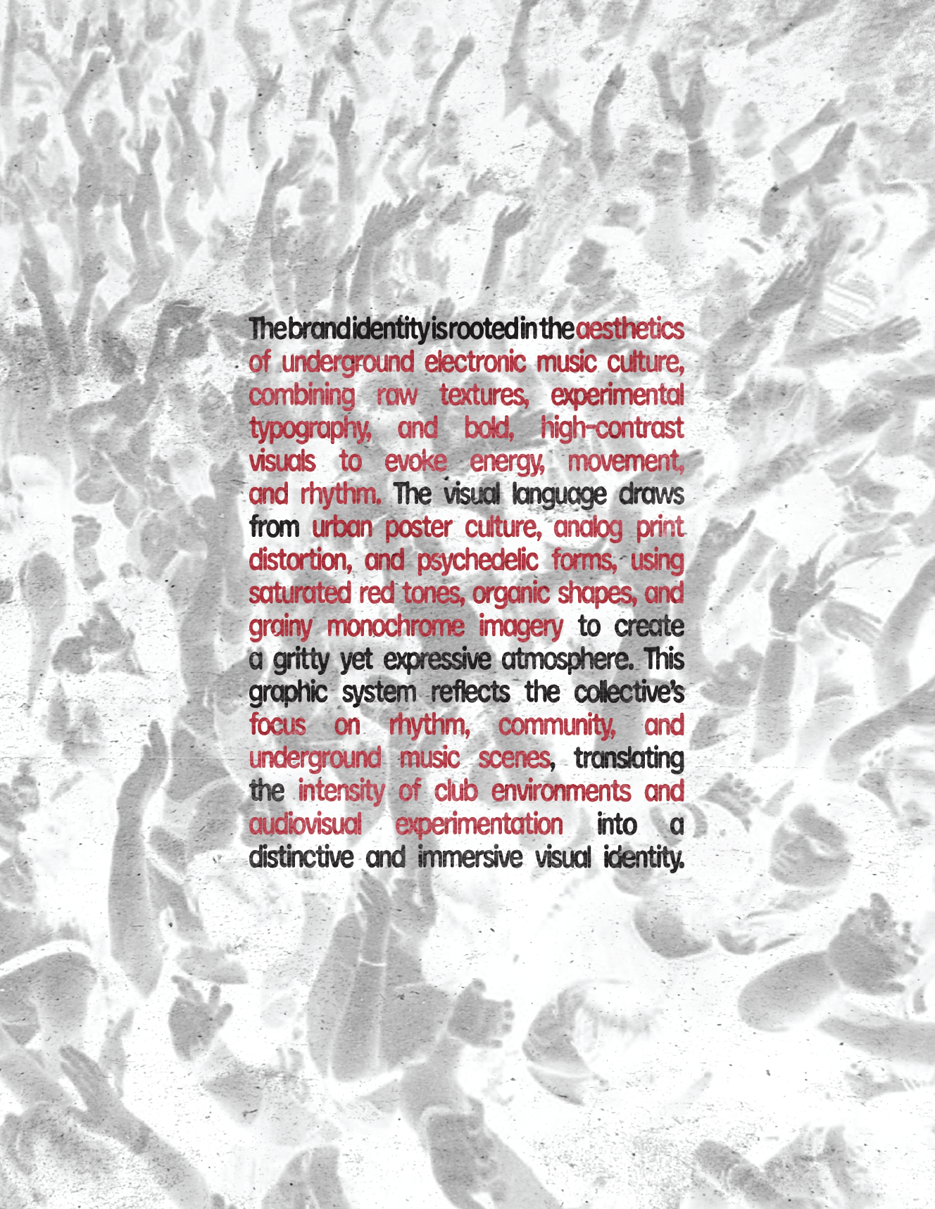 Drawing from scenes across Mexico City, Los Angeles, Madrid, Berlin, among other cities, the project reframes elements such as rhythm, community, repetition, and contemporary music into a graphic identity — including laser-inspired color use, type density, distortion, textures, and minimalism with a touch of brutalist inspiration.